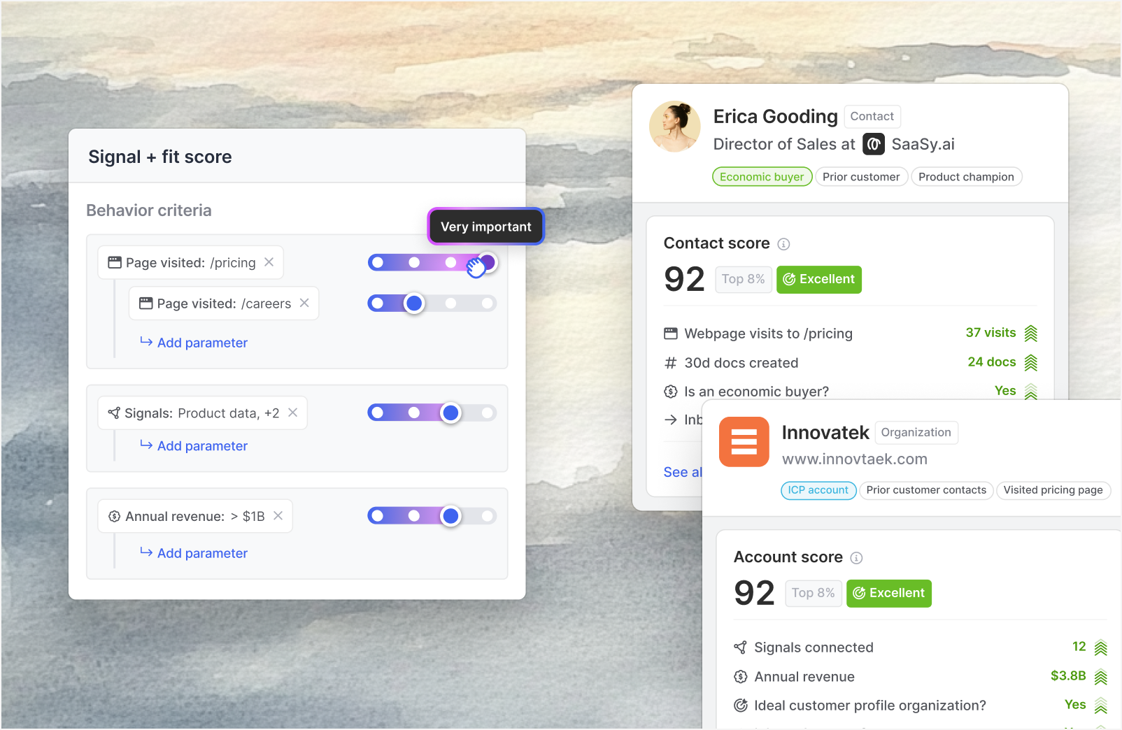 Common Room’s contextual scoring—which shows you exactly which attributes and actions are being scored for every contact and account—makes it easy for reps to prioritize the best prospects and disqualify cold leads.