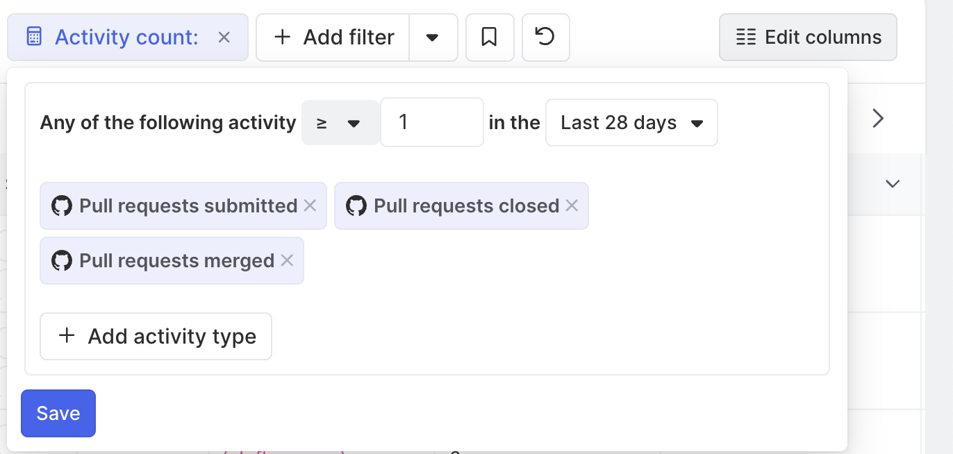 As an example, you may want to track active contributors in your GitHub repository over the last month. Start by clicking the dropdown menu next to the filter button in the menu bar, and selecting Activity count. Then, select the GitHub activities that are important to you; in this example, you'd want to filter for Contacts who have one or more pull requests that were submitted, closed, and merged within the last month.
