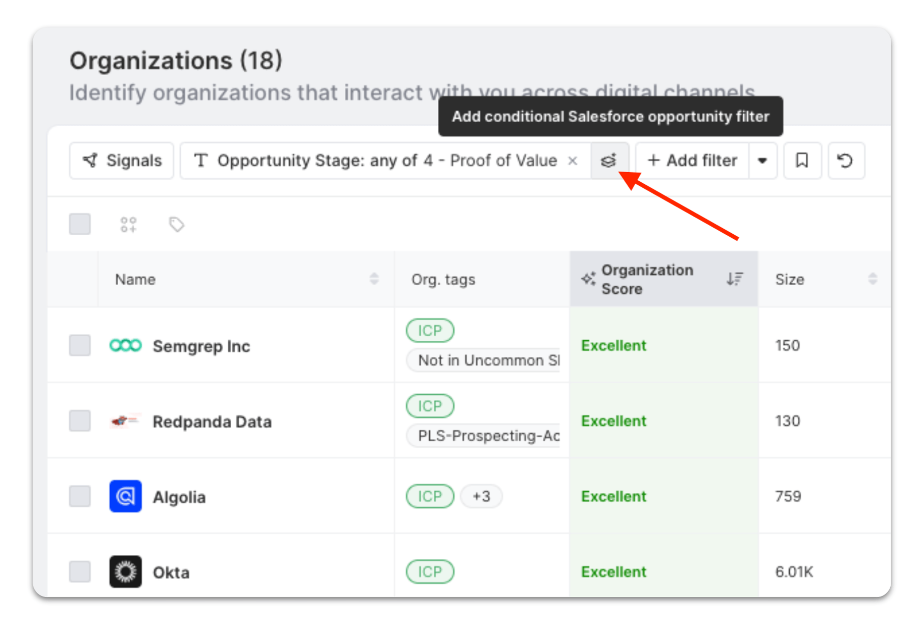For objects in Common Room that may have a 1:N relationship with another object, our conditional filtering feature allows you to specify filters on the related object to ensure it meets all of the criteria. If you have a use case where you want to find organizations that have a Salesforce Opportunity that is in Stage X and greater than $Y, you would want to use the conditional filter option when building your filters for Salesforce Opportunities: