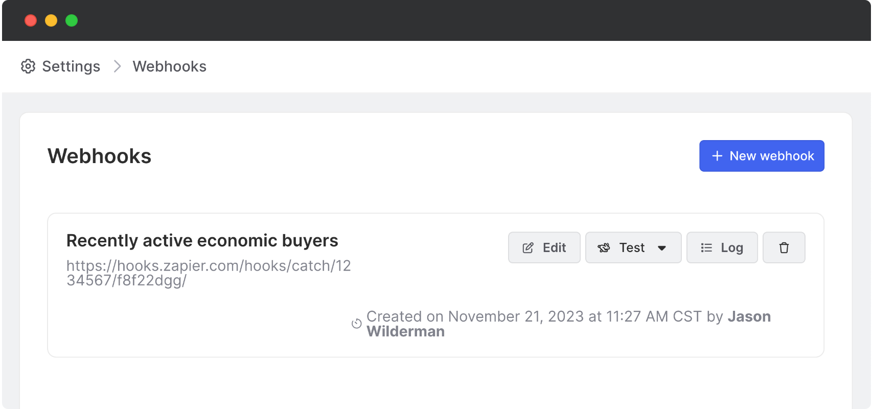 After creating, testing, and saving your webhook, you'll see it listed on the main webhook settings page.