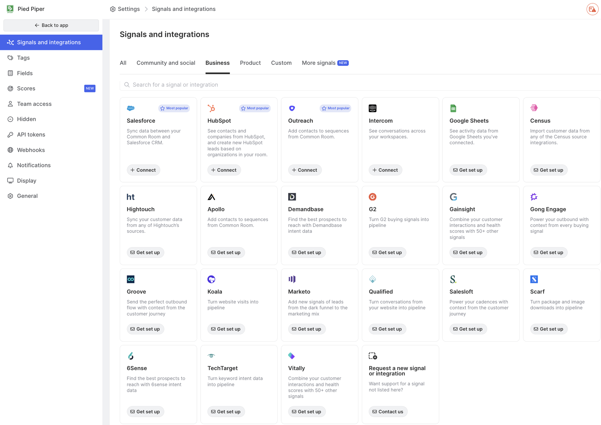Common Room provides a suite of integrations for key business sources of contacts, organizations and their signals.