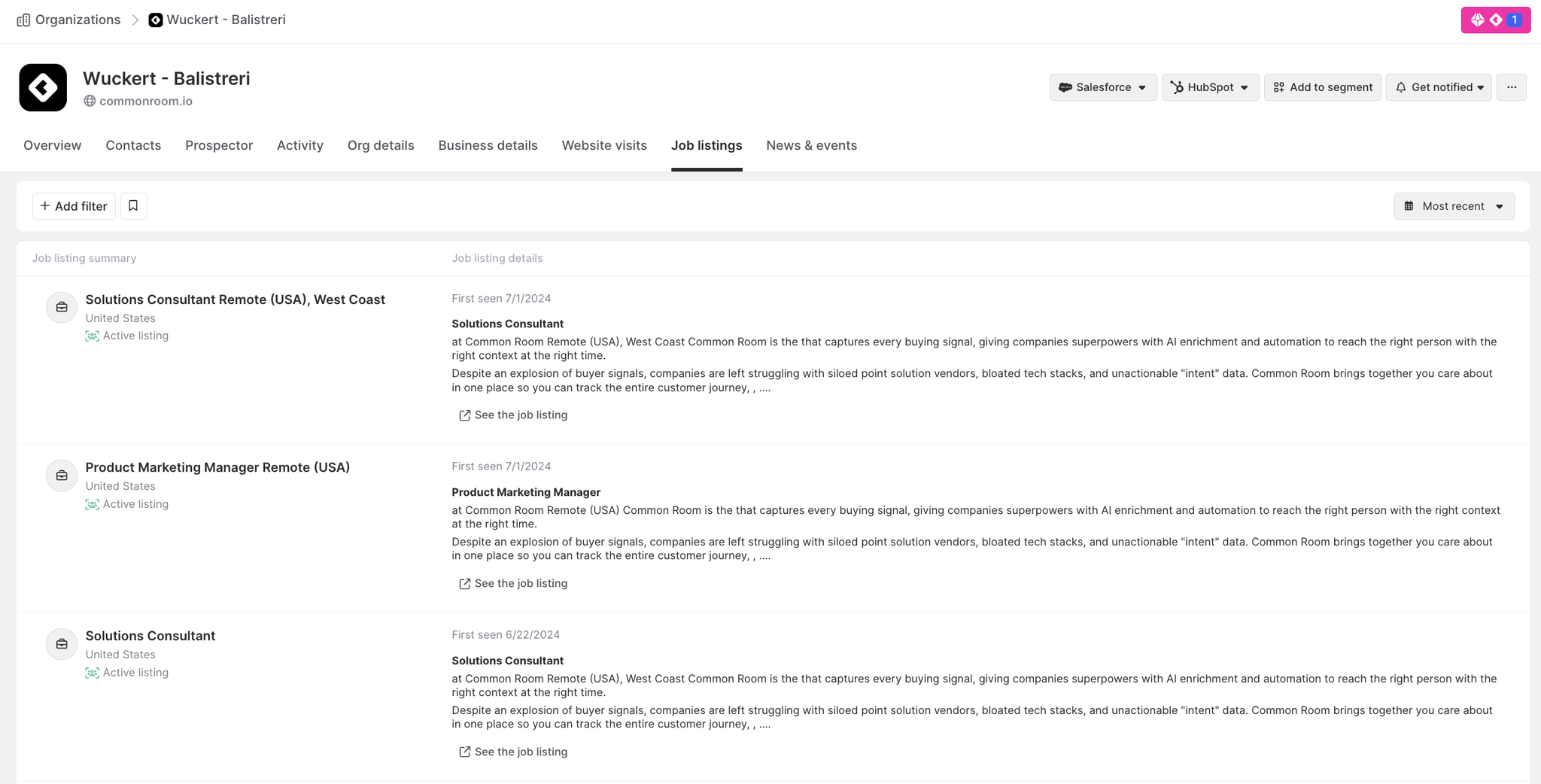 Job listings are an out of the box signal that all organizations in Common Room have. To best use job listings, you can target organizations using job listings filters to help you find job openings corresponding to certain functional roles, locations, or keyword searches to identify specific signal from a job listing.