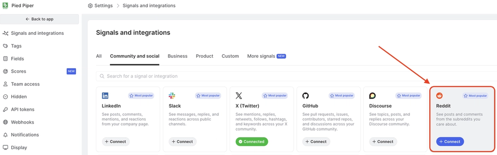 - Connect Reddit: When you connect Reddit, Common Room will surface Activity and insights from posts and comments in the subreddits you care about.