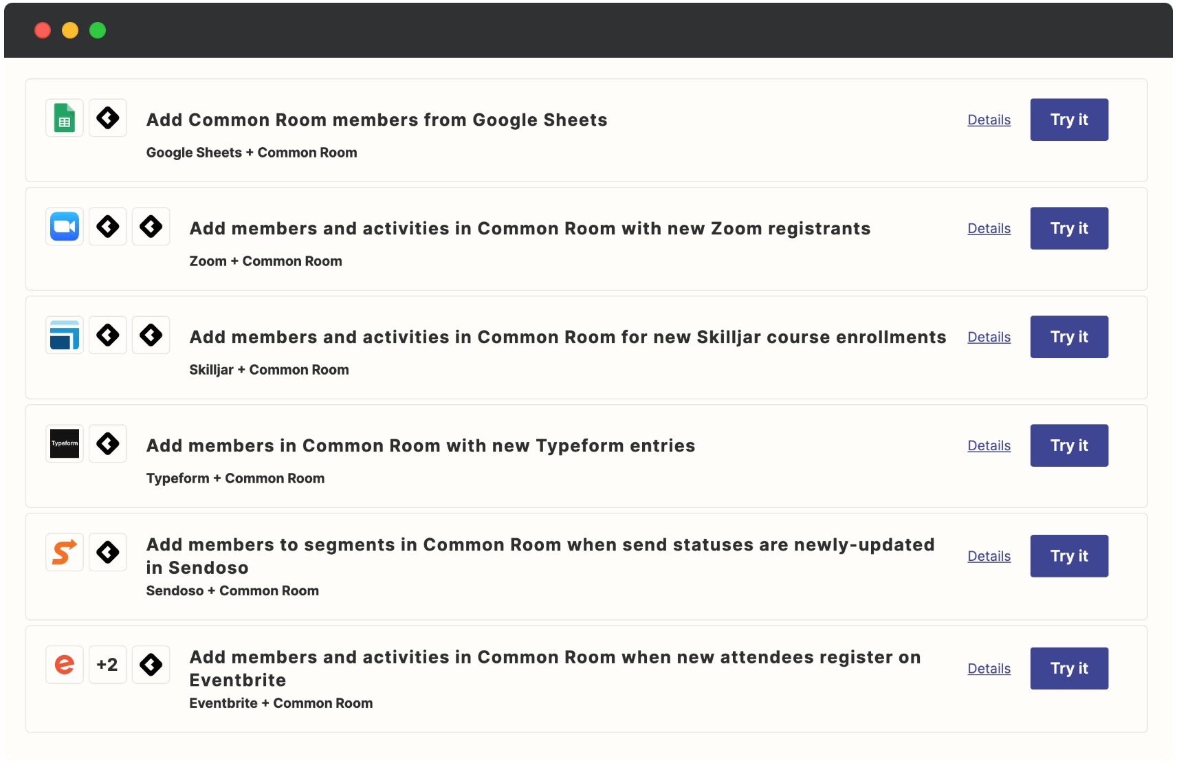 Here are some more examples that show just a few of the many ways you can integrate Common Room with other applications through Zapier.