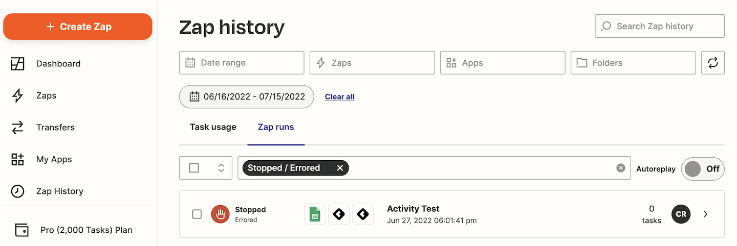 Always check the error in your Zap before making changes to your Zap. If you change a Zap, you may not be able to replay it. So it’s always best to check out what’s causing an error before modifying anything. To do this, go to “Zap History” in your Zapier account. This is typically in the left navigation bar. Look at your “Zap runs” and filter to runs with “Errored” status.