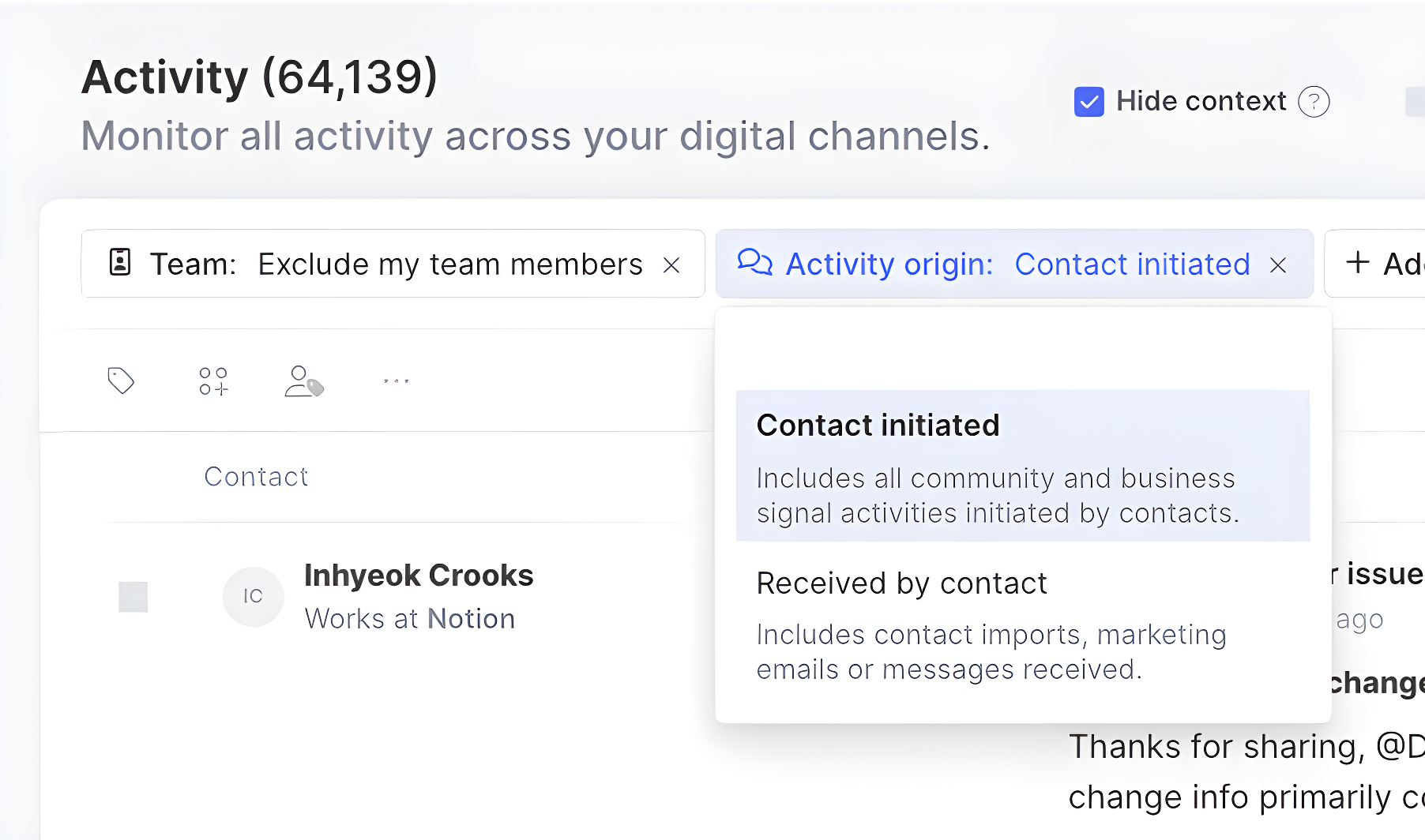 Filters are a property of any Contact, Activity, or Organization within Common Room by which data can be organized. A new filter — Activity Origin — allows you to filter ContactS, Segments, Activities, and Organizations by Contact Initiated or Received by Contact.