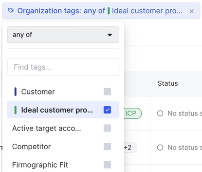 Then we’d apply an Organization tags filter and select Ideal customer profile.