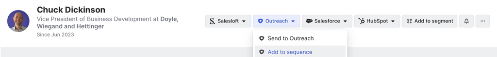 We’d simply click on the task dropdown menu and choose from our list of options, including adding them to a personalized email sequence in our sales engagement tool of choice.