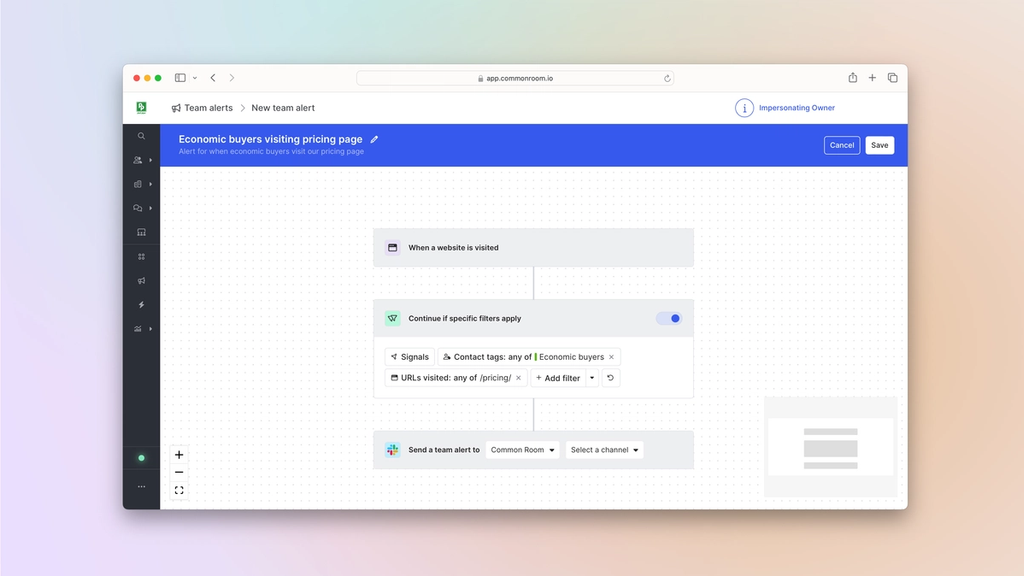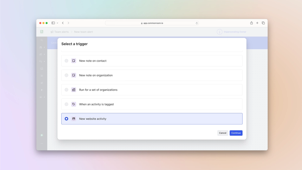 Team alertsCommon Room’s team alerts feature allows you to automate alerts based on any combination of triggers and filters so you can see real-time activity from the people and accounts you care about. This makes it easy to always stay updated on specific individuals and organizations.