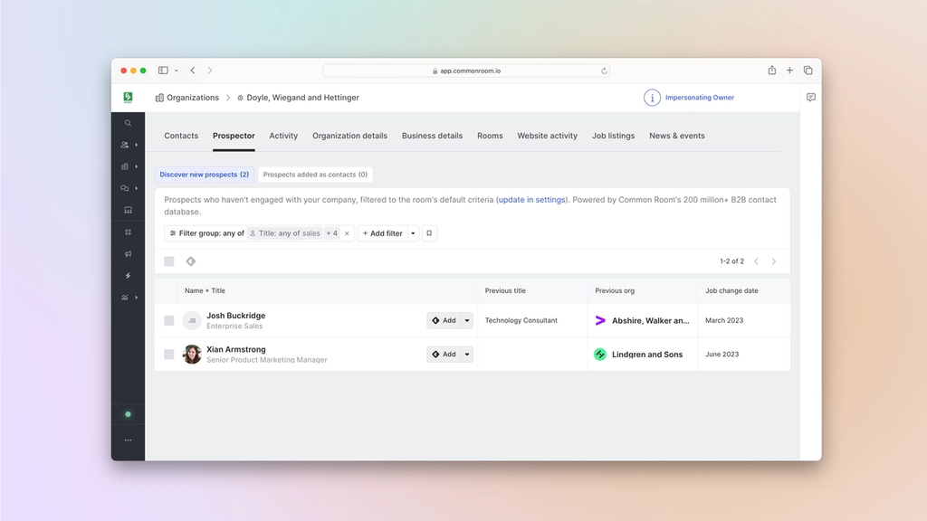 Common Room’s Prospector feature allows you to search through a proprietary, constantly refreshed database of more than 200 million B2B contacts, surface employees at specific organizations, and add them as contacts—even if they’re not currently engaging with your organization on any connected channels or tracked in your CRM.