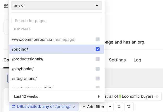 Let’s say we want to know whenever an economic buyer from one of our owned accounts visits our pricing page.