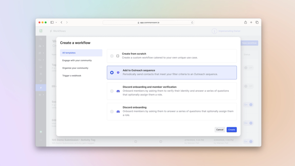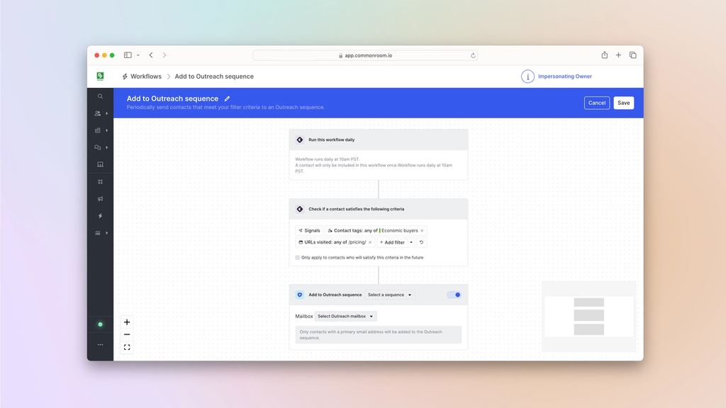 WorkflowsCommon Room’s workflows feature allows you to create and customize automations based on specific demographic, firmographic, and activity details. This makes it easy to quickly track, organize, and engage people and accounts at scale.