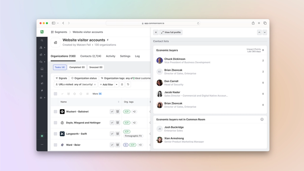 Common Room’s segments feature allows you to automatically add individuals or organizations to auto-replenishing lists based on customizable criteria. This makes it easy to quickly surface, monitor, and engage specific people and companies at scale.