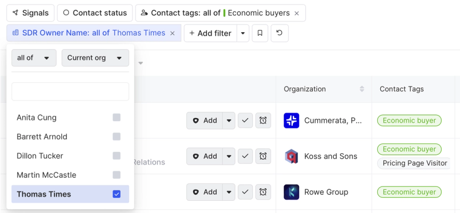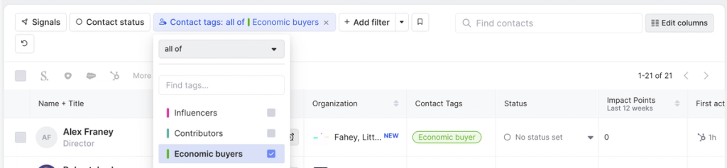 First we’d add a Contact tags filter and select Economic buyers.