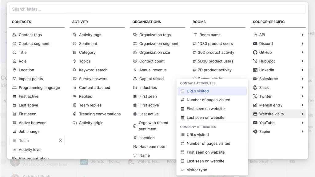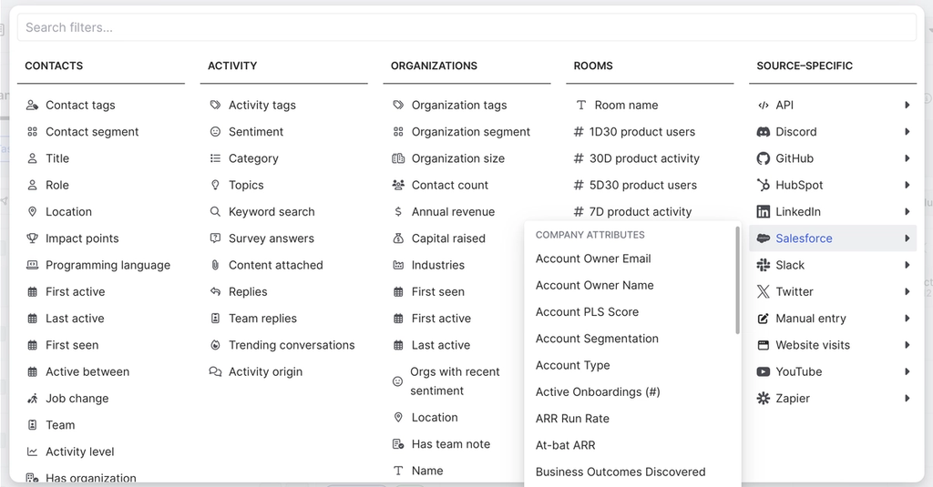 Common Room’s filters feature allows you to highlight individuals and organizations based on any combination of factors. This makes it easy to surface specific people and companies based on firmographic details, cross-channel activities, product usage, and more.