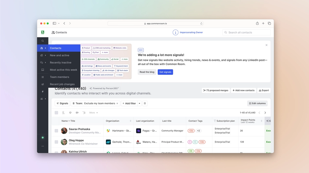 Person360Common Room’s Person360 feature allows you to deanonymize, merge, and enrich signals from every channel connected to Common Room. This makes it easy to reveal the identity, intent, and context of every buyer and customer.