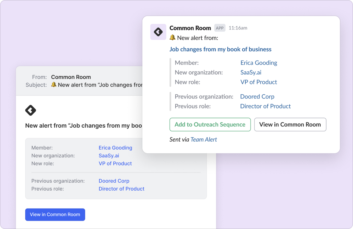 Send real-time alerts via Slack or email the moment a buying signal from an ideal prospect or target account is identified.
