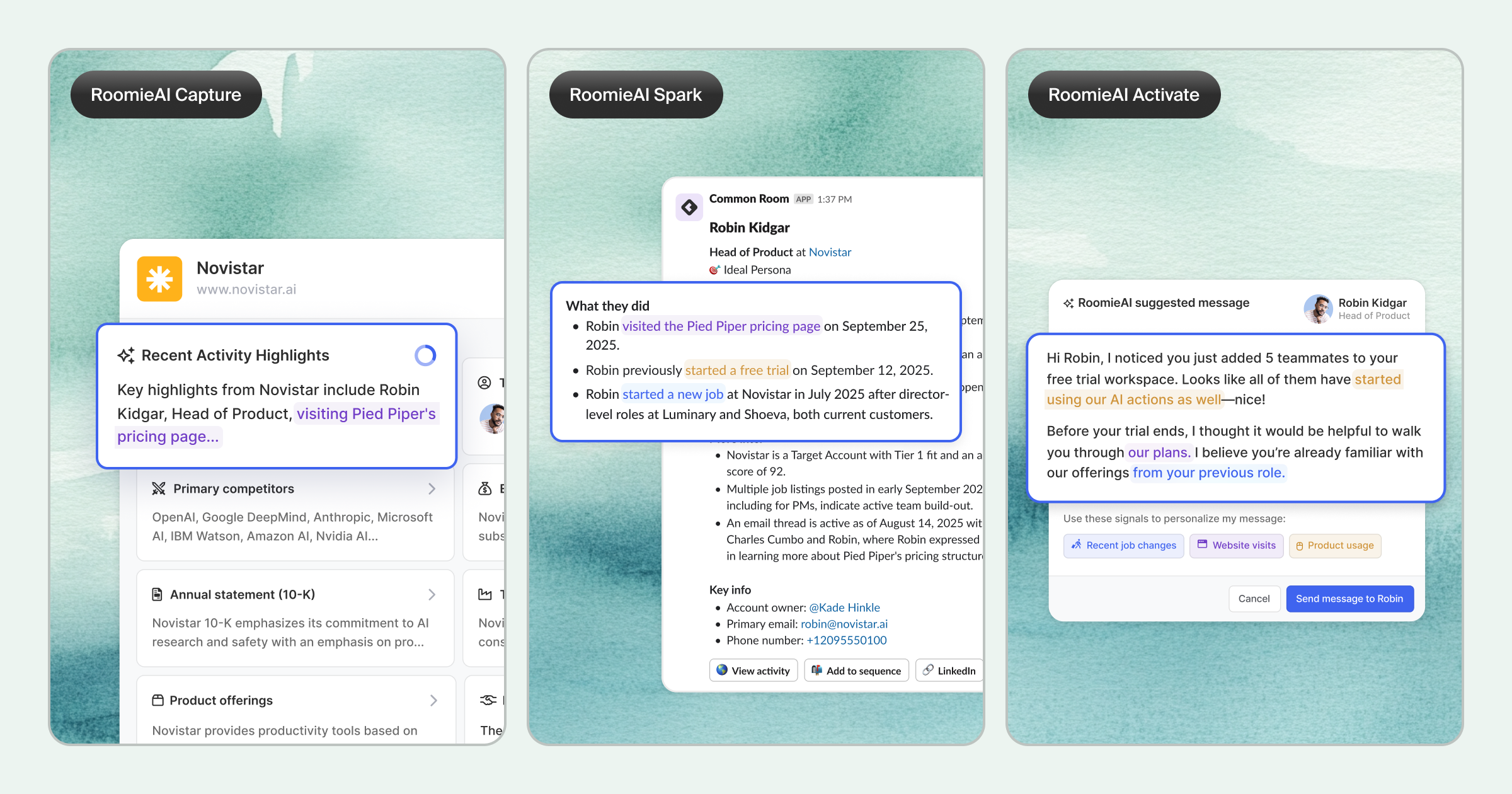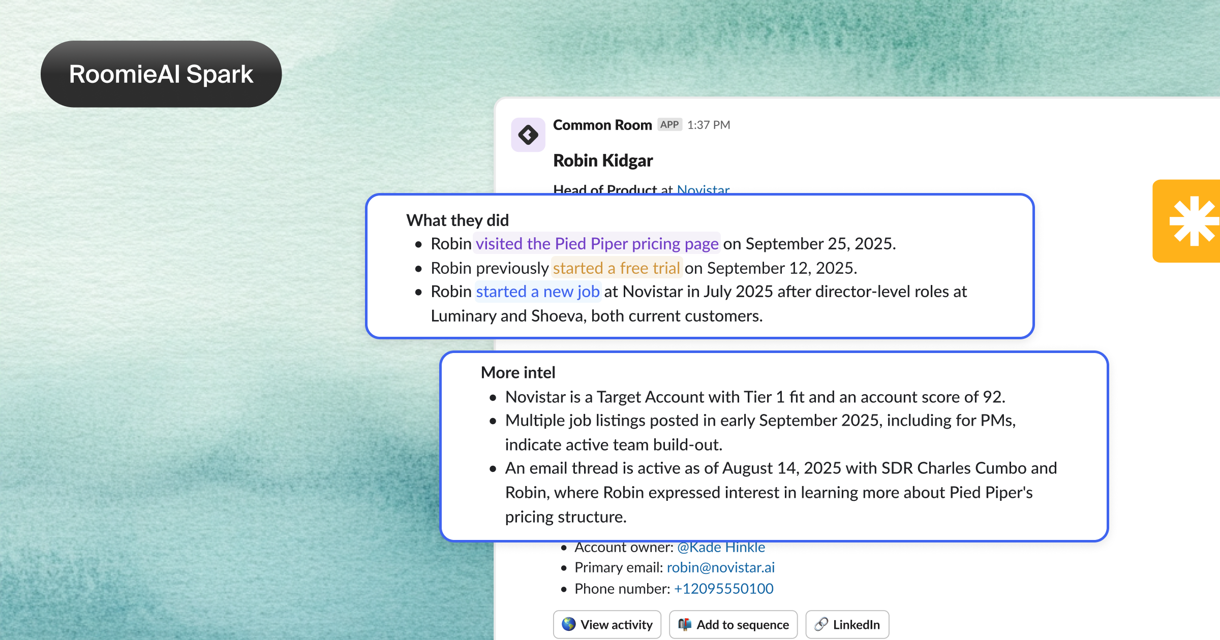 We call it RoomieAI Spark, and it makes it easier than ever for sales reps to know exactly who to target, when to reach out, and what to say—whether they’re working in Common Room or Slack.