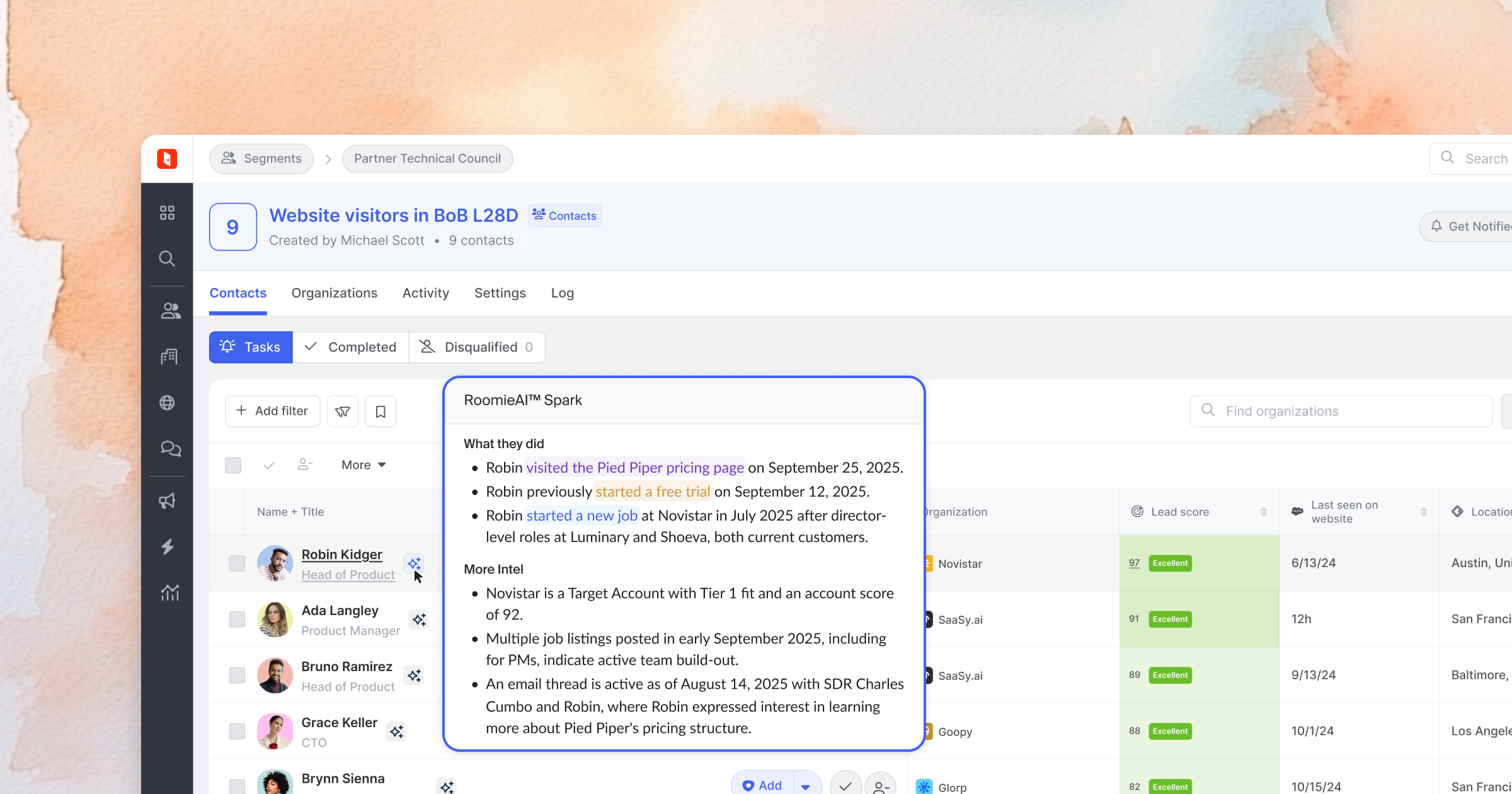 Our new person research agent, RoomieAI Spark, makes it dead simple to execute against these signals instantly and with full confidence by providing reps with AI-summarized behavioral and firmographic research that pinpoints top leads and tells them everything they need to know about why and how to reach out right now.