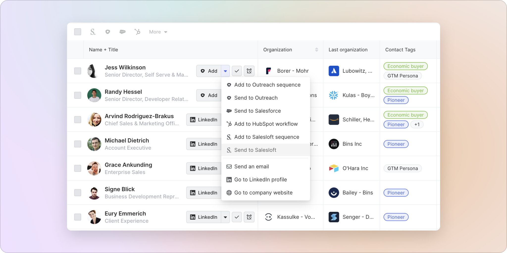 Not only can you add these individuals to Salesloft as prospects, you can push this granular, person-level context straight to your CRM to flesh out profiles for new and existing contacts.