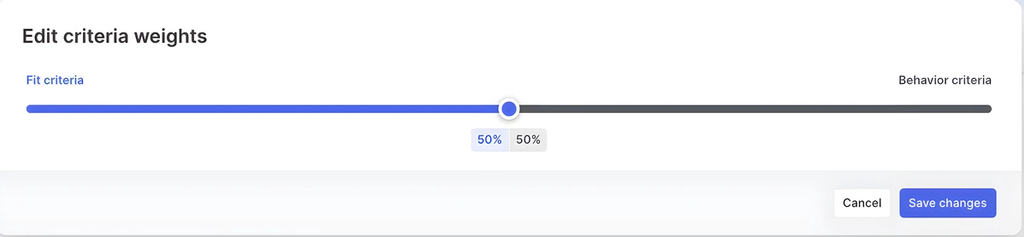 - Once you have gone through and created fit and behavior rules you can apply another Criteria Weight to determine how much fit vs behavior rules weigh in your overall score. To do this, edit the weights that each bucket of rules will receive: