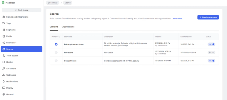 Scoring model creation begins in the settings tab of Common Room. Models can be created for both Contacts and Orgs. Each room is allowed to create multiple models but only five models can be enabled at the same time. Once scoring models are enabled they will show as custom fields on Contacts and Orgs and can used and managed in the same manner that other custom fields are in Common Room.