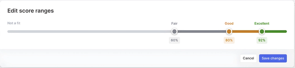 Scores for Contacts and Orgs will ultimately be calculated by taking the total number of points the record has and deriving the percentile of that score against all other contacts or organizations with that score. The output of this will be the percentile (e.g. 90th percentile) calculated by the weighted addition of the fit and behavior inputs you've defined. - The last setting that you will need to set up is Scoring Labels. To make scores easily digestible to end users, Common Room translates the numeric values into a plain language label. You can edit the corresponding ranges of scores that relate to each label. Score ranges are defined by the calculated percentile of a record. Contacts which do not yet have a score will have a null score on the backend, represented as the 0th percentile in the product.