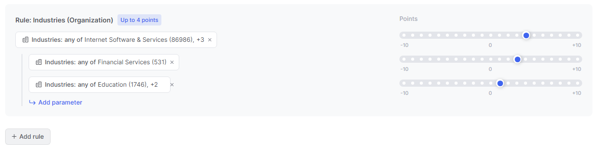 - Rules - Scoring models are composed of rules. Those rules can be classified as Fit or Behavior. Each rule is limited to a single field at a time (e.g. build a rule using Job Title).
