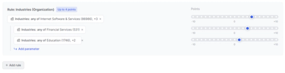 - Parameters - Rules are composed of parameters. Parameters are the specific values from the field that you want to use in scoring. For example, with Job Titles you may want to specify that Contacts whose titles include “marketing” is your most important parameter.