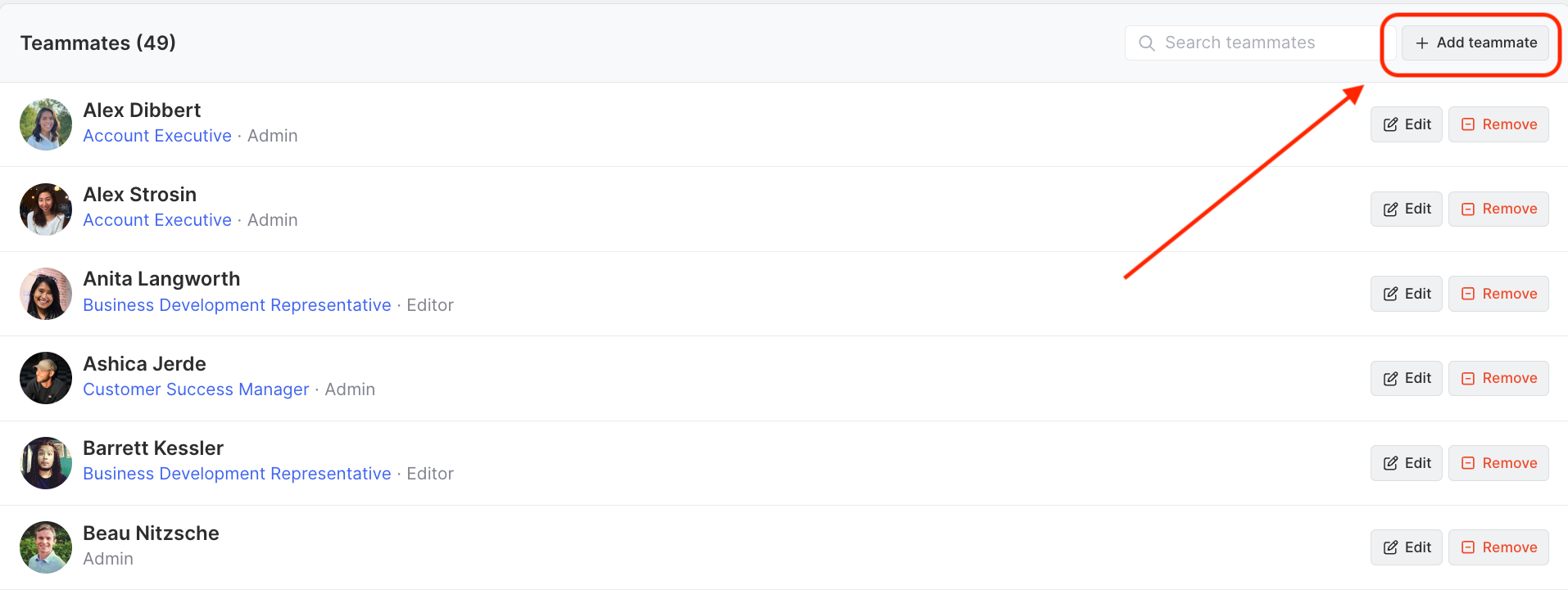To add teammates to a role, click the Add Teammate button in the teammates table.
