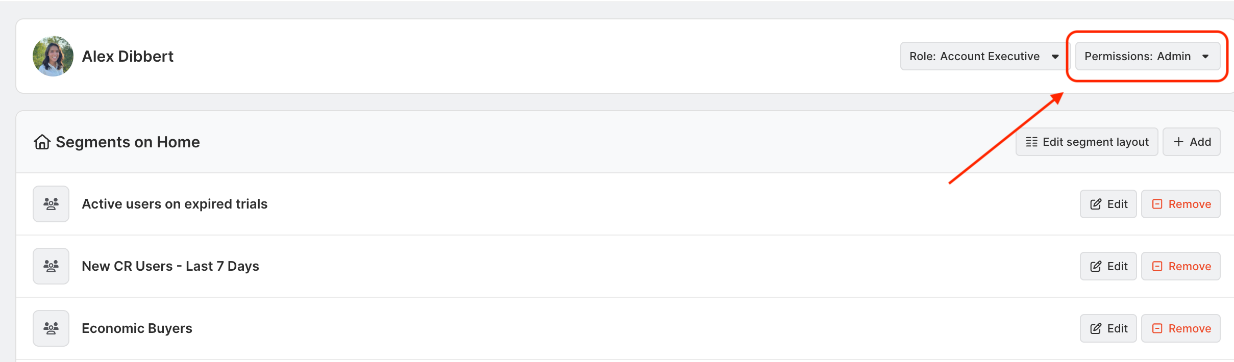 When editing a teammates profile, you'll see a list of segments. Segments on home is a list of segments that a teammate has added to their Common Room home page. My segments is a list of segments that a teammate has created.