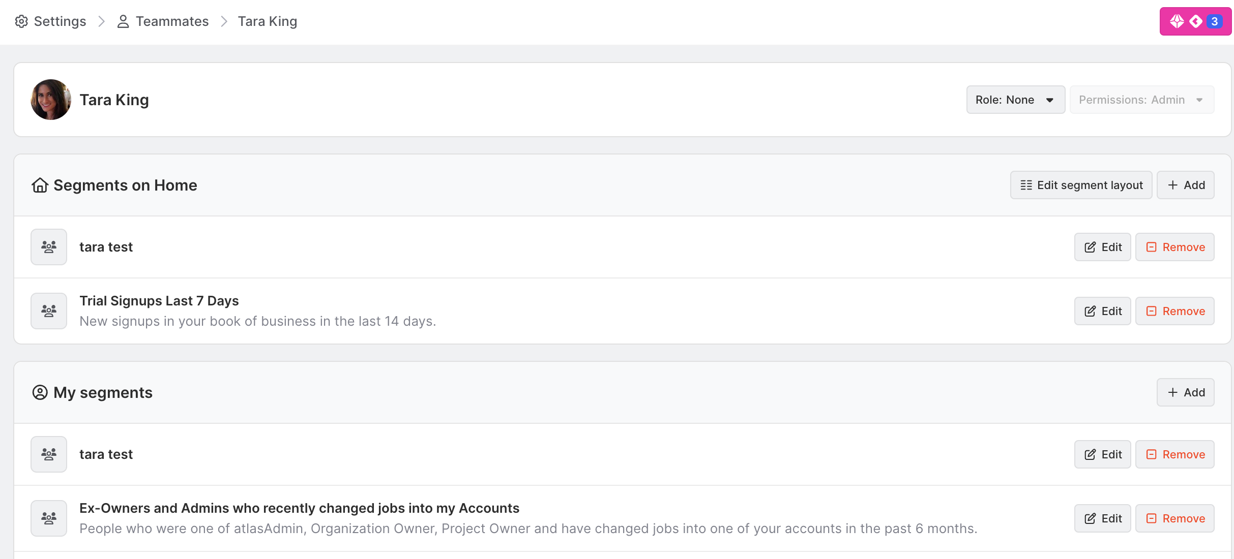 - If you'd like to edit the order of a teammate's segments in their home view, select "Edit segment layout" in the "Segments on Home" section. If you'd like to edit the order of a teammate's segments in their "My Segments" view, select "Edit segment layout" in the "My segments" section.