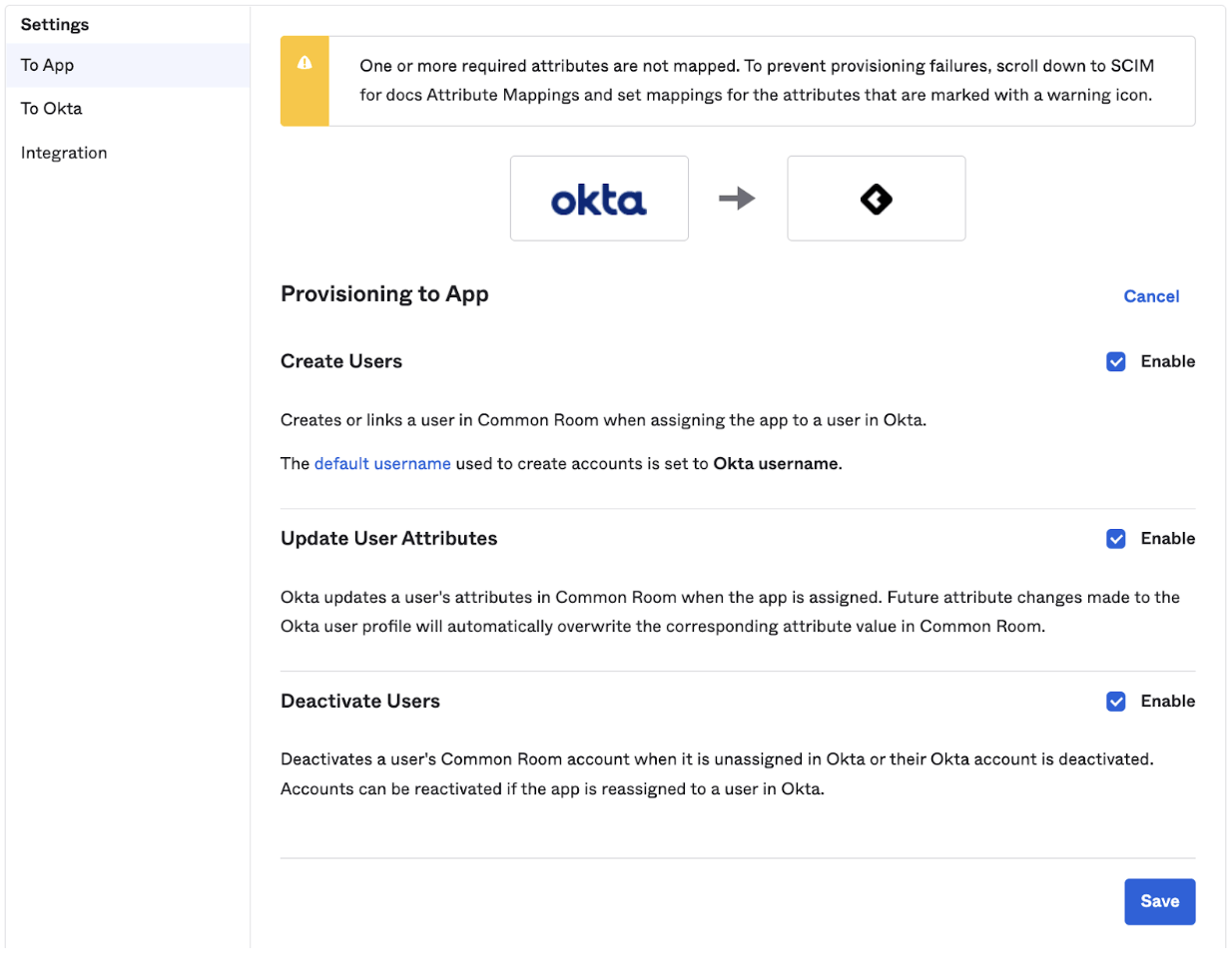 You can provision user accounts in the Common Room application through SCIM. SCIM supports the following features: