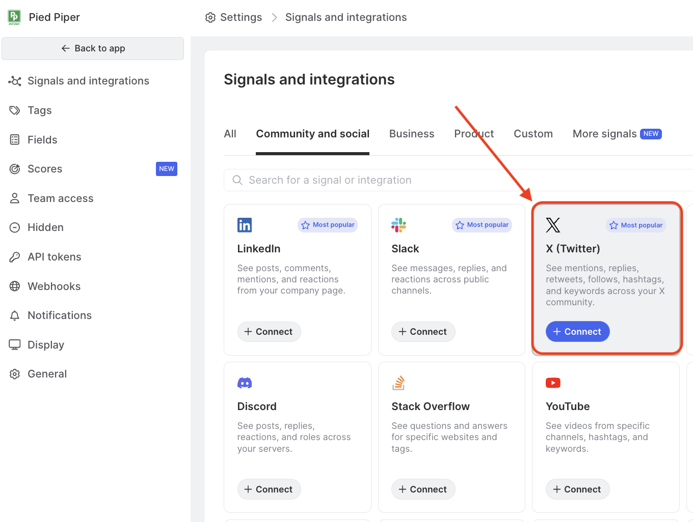 - Connect X (Twitter): When you connect X (Twitter), Common Room will surface activity and insights across mentions, hashtags, and keywords.