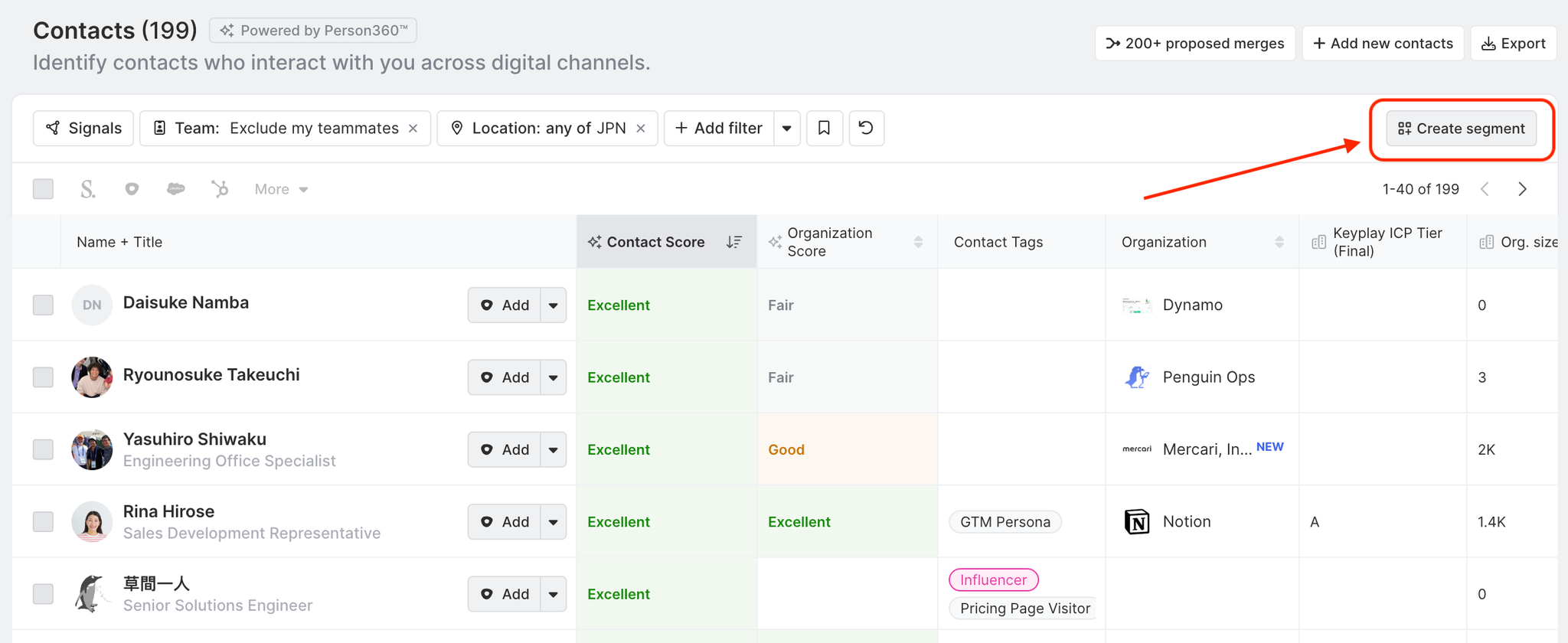 In addition to filtering by Contact attributes, you can add-on Activity, Organization, and signal-specific filters.