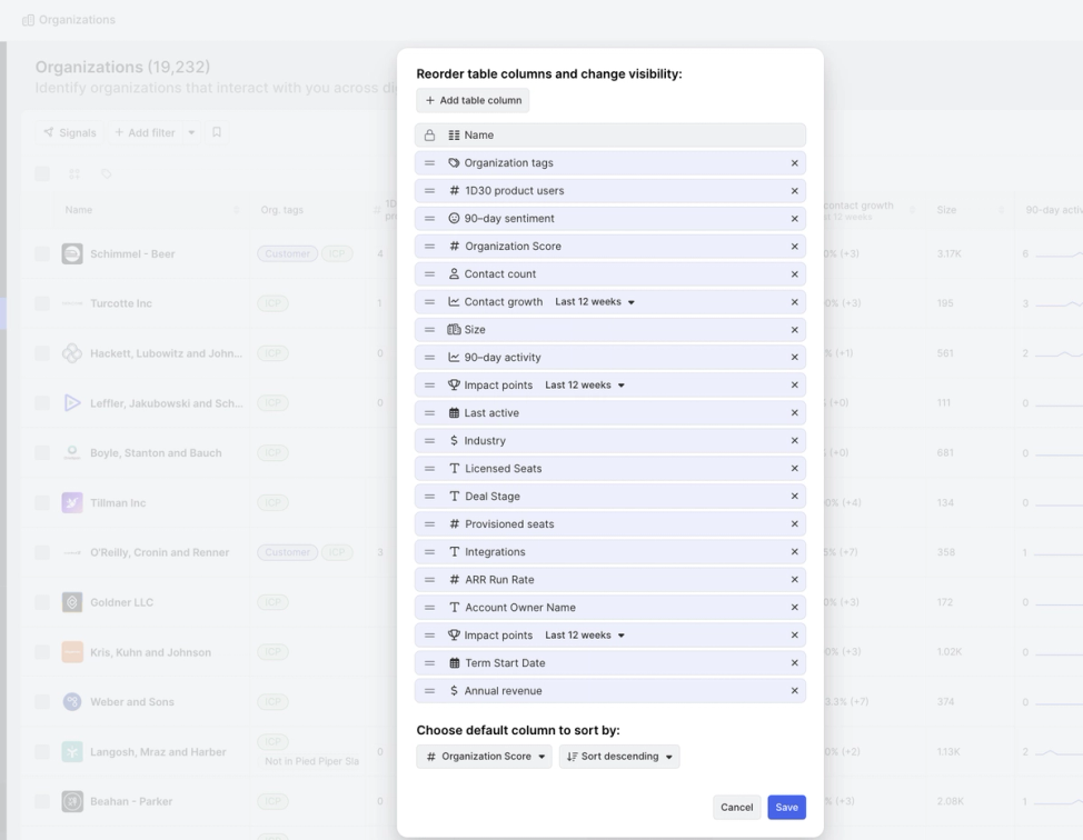 When viewing organizations (as well as members and segments), you can customize the columns displayed by clicking Edit columns at the top-right of the list.