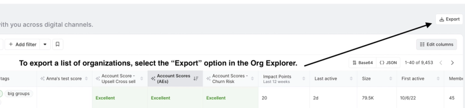 When viewing the main organizations page in Common Room, there are a variety of ways you can interact and customize the list of organizations. To export a list of organizations, select the "Export" option in the top right corner.