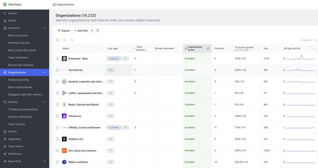 The organizations list can be filtered to make it easier to find specific organizations that interact with you. If you've found the perfect set of filters and want to monitor this list of organizations, use the "Create segment" button on the right side of the filter section and your new organization segment will be pinned to your home. Learn more here →