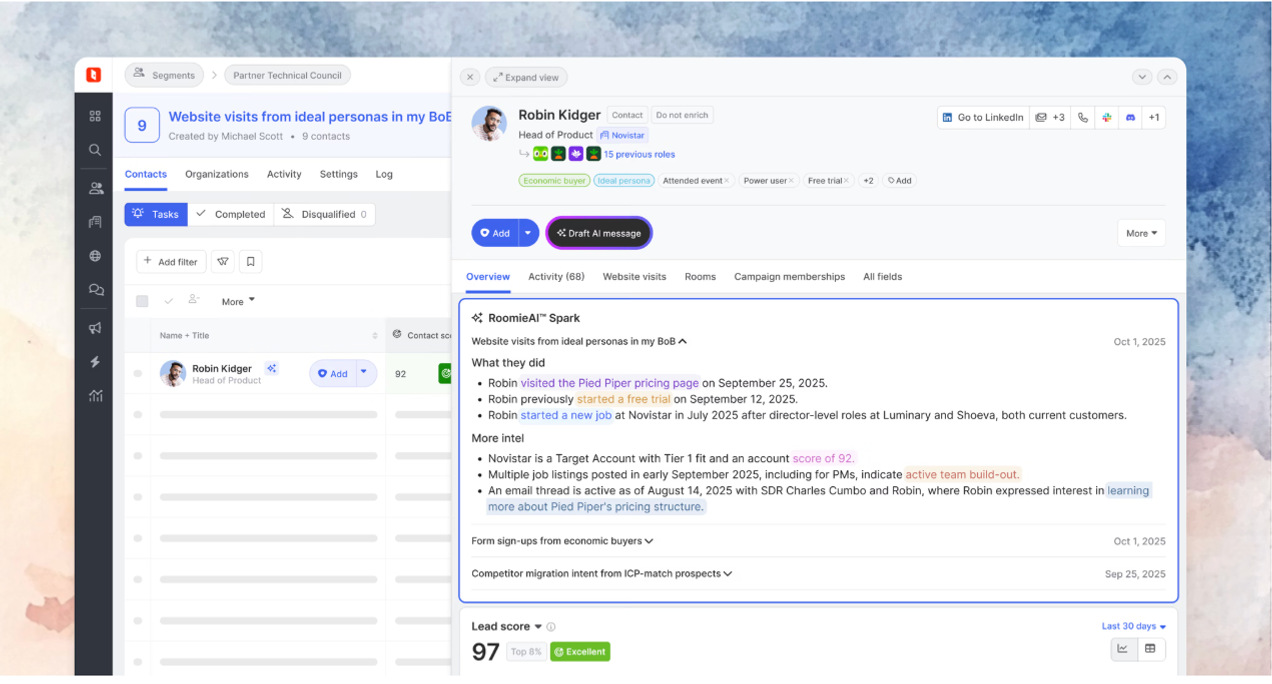 RoomieAI Spark automatically synthesizes and summarizes person-level research so your reps can focus on selling instead of searching. Powered by Common Room’s segments, Spark analyzes recent buying signals, persona and account fit, business context, and more—then surfaces it directly where your team works.