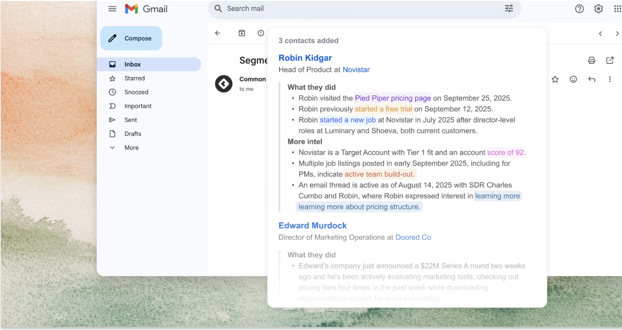 You’ll receive real-time alerts in Slack or email that tell reps who to engage, why they matter, and what to do next—complete with contextualized insights, account activity, and recommended actions.