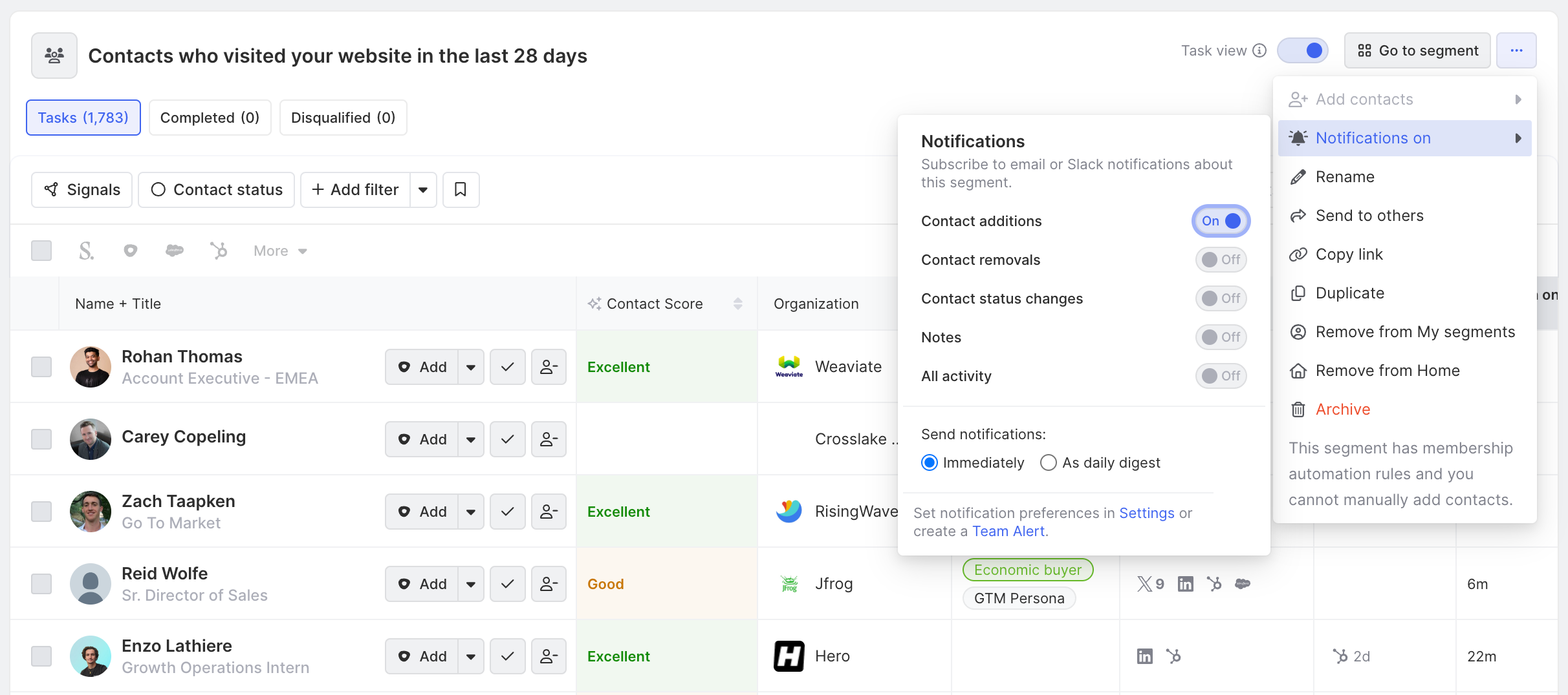 To stay on top of key changes being applied to a Segment, you can subscribe to email or Slack notifications. Start by clicking the notifications button at the top-right of your Segment. You can then choose to subscribe to immediate or daily digests about: