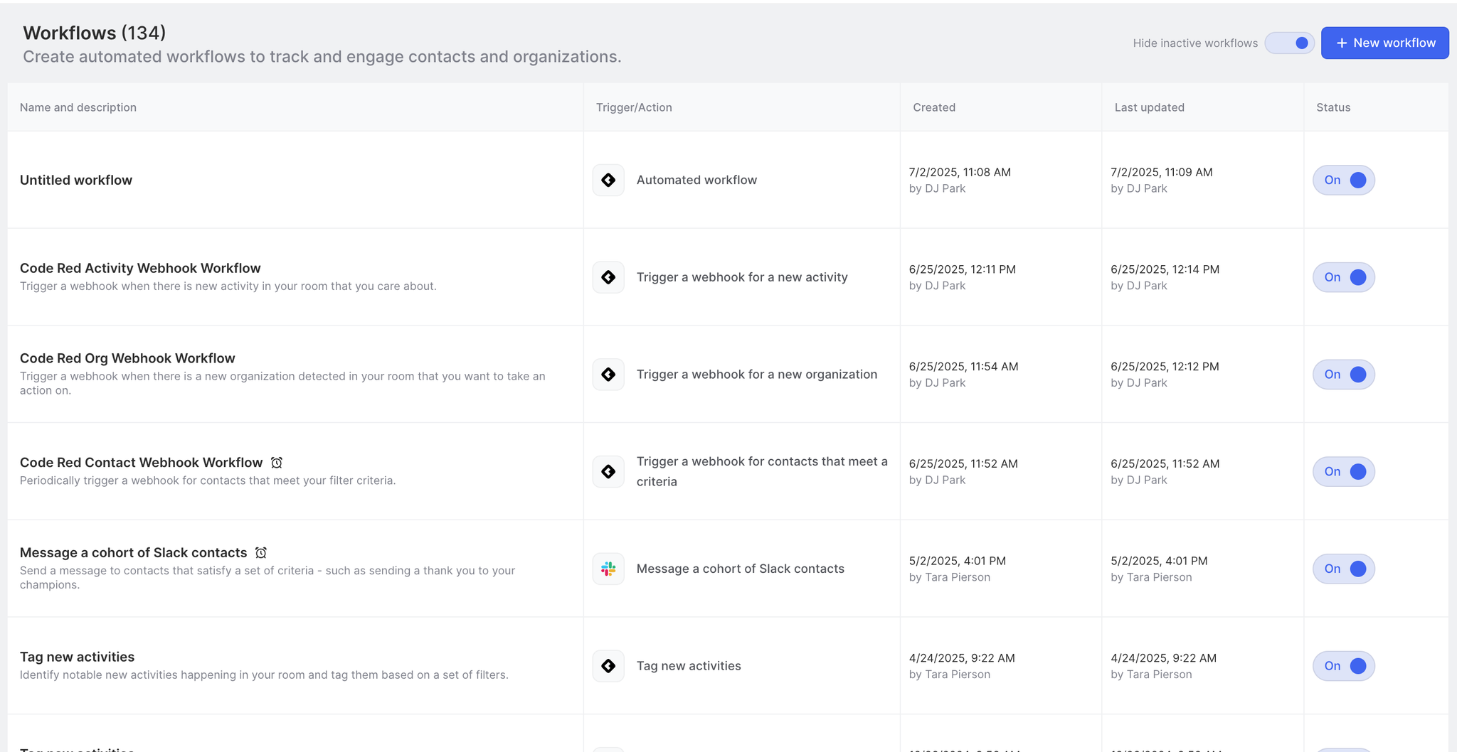 Workflows enable you to create automated workflows to track, engage, and organize Contacts and Organizations with customizable logic. Workflows are made up of three components: