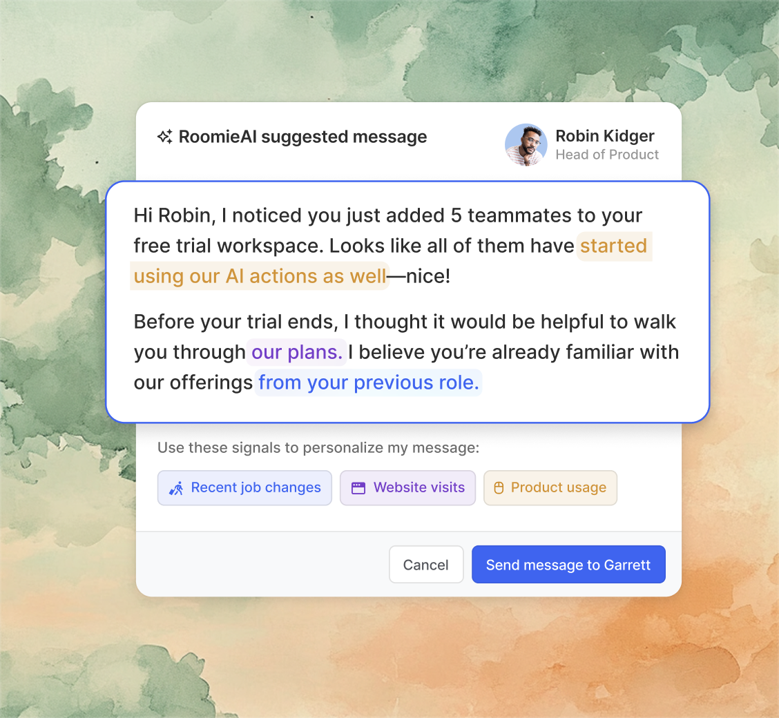 Generate outbound messages that actually convert with RoomieAI™ Activate, our outbound agent that incorporates buying signals to personalize outbound and meet the prospects where they are.