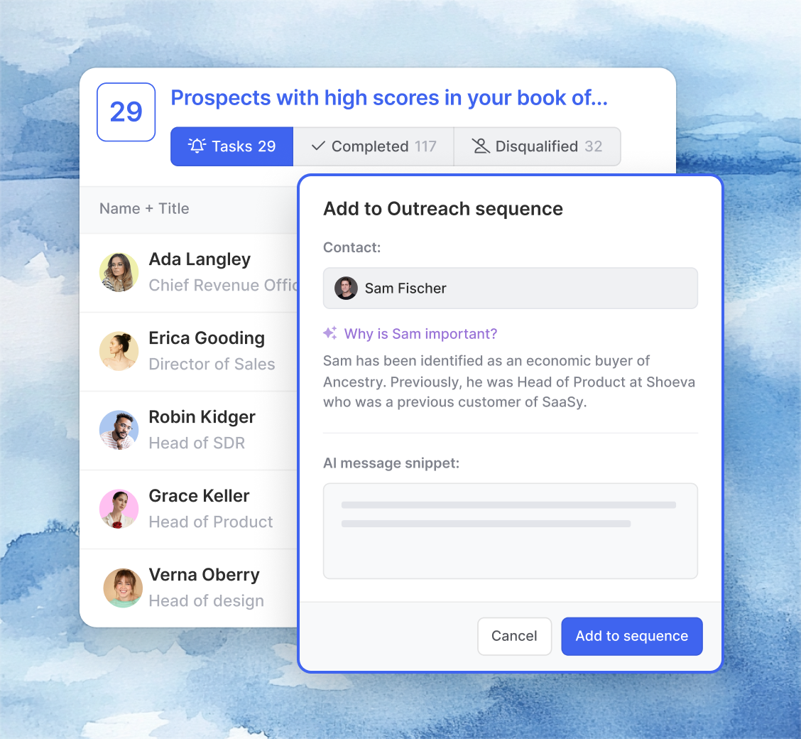 Sequence prospects, generate AI-personalized messaging, and more directly from SFDC, HubSpot, and LinkedIn.