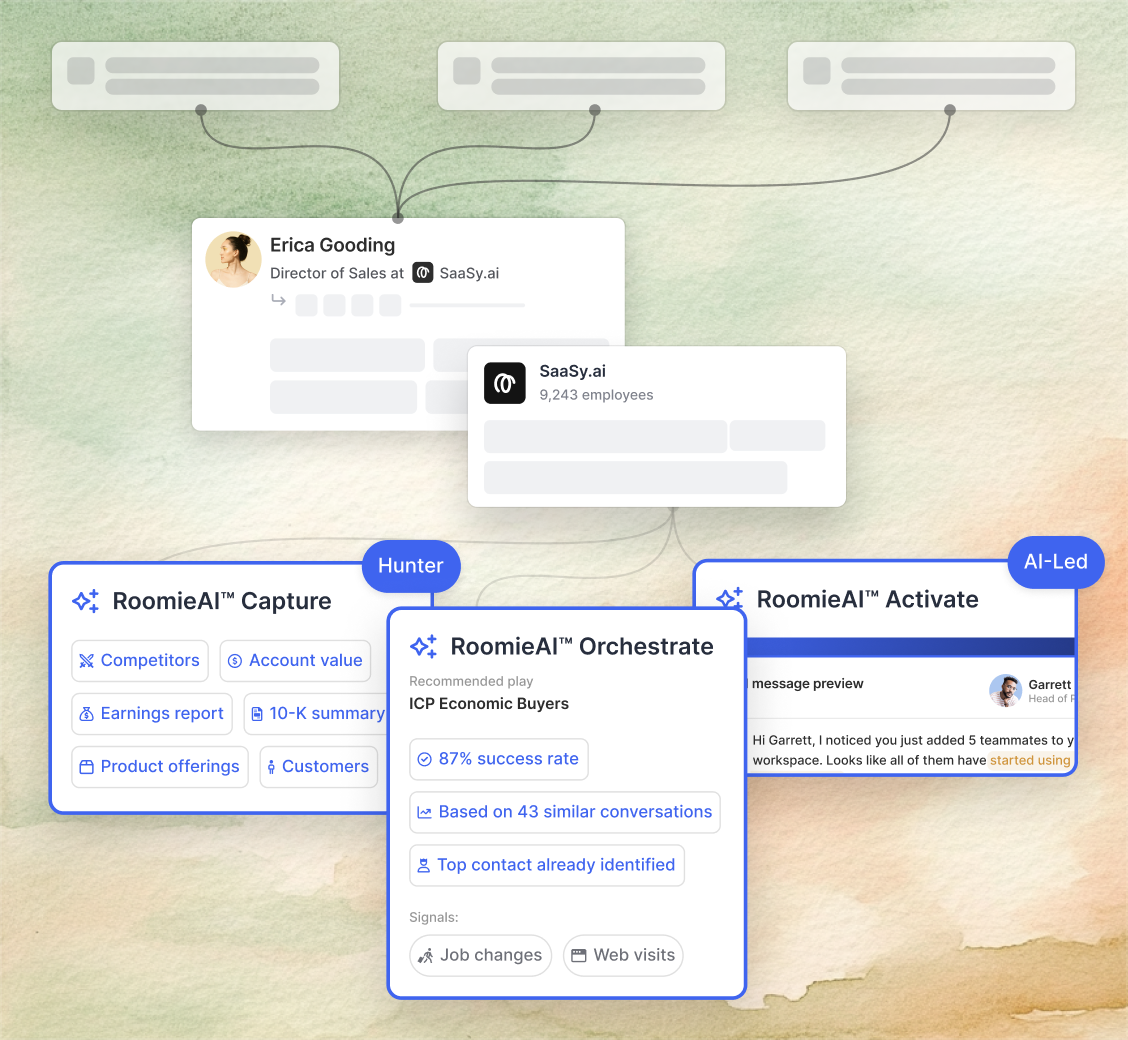 Give your reps a single workspace that replaces frustrating CRM interfaces. Prioritize opportunities through intelligent scoring and ready-to-execute plays. RoomieAI automates research and personalized outreach, eliminating system-hopping while boosting output.