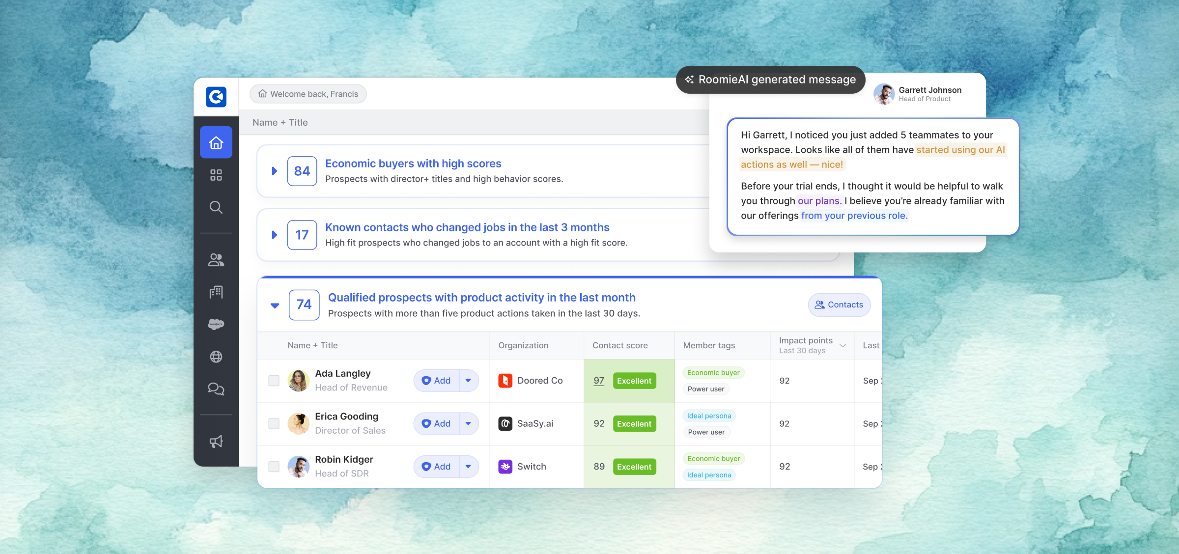 Let RoomieAI™ Activate, our warm outbound agent, do the heavy lifting of generating outbound touches that convert because they’re informed by the context of product usage.